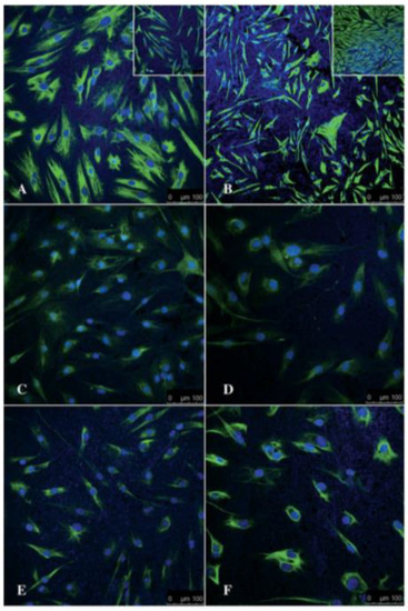 Representative 2D confocal microscopy images of hMSCs differentiating into cells of neural lineage on an AuNR substrate. Images show the expression of Vimentin, S100β, and GFAP at 24 h (A, C, and E, respectively) and 6 days (B, D, and F, respectively) after differentiation. The insets in A and B show the corresponding undifferentiated controls at 24 h and 6 days. Scale bar = 100 μm. Reproduced with permission from [9]. Springer Nature, 2014.
