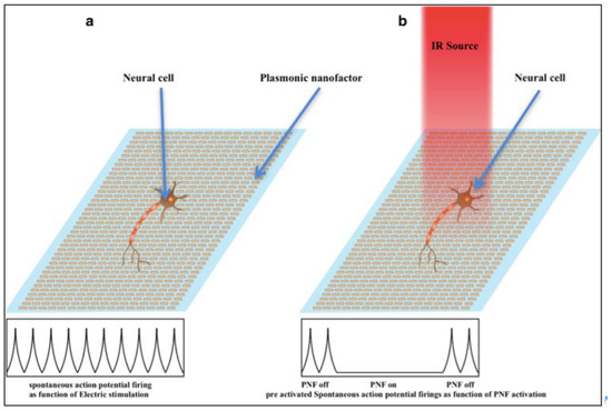 Exploiting the interaction between cells and plasmonic nanofactors (PNFs) is one of the promising emerging methods for altering cell membrane potential and, subsequently, neuronal excitability. PNFs can function as a non-invasive, tunable “switch” to turn on or off the activity of neurons. The basic principle of this technique is to create a plasmonically active surface close to the neural cell; the cell properties can be altered by this surface, including modulation of the cell’s electrical activity. The development of PNFs that can affect neural activity should be based on an understanding of the events and factors that control the electrophysiological properties of neurons. Potentially, this technology could be used to control neural activation or to treat neural injury. Several factors must be considered to improve this technology, such as the ability to promote or inhibit neural activity, the nature of the surface-cell interactions, biocompatibility of the surfaces, the ability to use these surfaces to affect neural activity in a reproducible manner (i.e., without neuronal adaptation in response to the stimulus), and how to deliver or embed such surfaces in vivo [9,15,17,18,19,20,21,22,23].