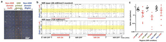 To validate the biofunctionality of the printed PNF surface, microectrode array (MEA) chips were used as a base for printing PNF, then hippocampal neurons were cultured for 15 days over the printed surface to form a neural network. The goal of this work was to investigate whether PNF activation can alter synchronized neural network activity. A non-continuous coating of PNF printed in the center of the substrate activated only a small area of the entire channel recording area, as shown in Figure 14. When the printed PNF was activated with (138 mW/mm2), the synchronized neural network activity was suppressed over the PNF domain, with maximun suppression occurring at the center of the domain, as shown in Figure 15b,c. However, many of the active channels in the non-printed domain showed similar reduction inspike rate when the IR laser was turned on.