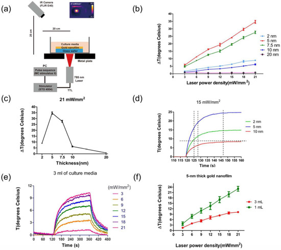 Another example of a neural network-PNF surface approach used for investigating the in vitro effects of PNF on neural behavior was reported by Lee et al. [19]. Figure 15 illustrates their general procedure. In this study, the researchers fabricated a plasmonic nanofilm via thermal evaporation of gold, whose plasmonic effects are detected in the NIR wavelength. Different film thicknesses (2, 5, 7.5, 10, and 20 nm) were produced in order to optimize the maximum plasmonic effect. To examine the plasmonic activity of the coating, an IR camera was used to track thermal activity of the samples under an NIR laser with a 785-nm continuous wave with 5-mm diameter circular illumination area; the power density was varied from 3 to 21 mW/mm2. The photothermal behavior of the PNF was dependent on the thickness of the coating and the laser profile (Figure 16).
