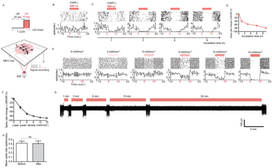 Cell-PNF surface interaction demonstrates an inhibition of neural network activity when the PNF is activated, making it useful to investigate the mechanisms by which active PNF produces neural inhibition. Yoo at al. [17] did so by attaching PNFs to the cell membrane of hippocampal neurons (isolated from prenatal rat brains) through incubation of the cells with 10 μg/mL of PNF (Figure 17A). Hippocampal neuronal networks were cultured on a multichannel MEA chip, then the PNF were added with different incubation times (1, 3, 6, and 9 h). AuNRs were used as the PNF model (AuNRs functionlized with SH-PEG-NH2 with longitudinal plasmon resonance at 785 nm). The team investigated whether the activation of PNF influenced spontaneous neuronal activity of the hippocampal neurons. First, the spontaneous activity of the neurons was investigated under NIR irradiation or GNR treatment alone as a control. No effect on neural activity was detected in either case (Figure 17B). Upon activation of PNF with an IR laser pulse, the recorded spike rate significantly decreased as a function of increasing incubation time. The maximum inhibition of neural activity was achieved with 9 h of incubation, as shown in Figure 17C,D. Moreover, the degree of inhibition could be tuned by changing the laser power characteristics. For example, increasing the laser power from 0 to 15 mW/mm2 increased the inhibition proportionally from 0 to 89.6% (Figure 17E,F). This result shows that increasing the degree of PNF activation produces more heat, leading to a pronounced suppression of neural activity.