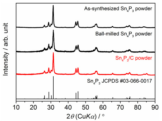 Tin phosphide Sn4P3 (theoretical gravimetric capacity = 1255 mAh g−1) is known as one of the high capacity alloy-based anode materials for LiBs [8,9,10,11]. Sn4P3 has a layered structure (space group: R-3m) suitable for lithium insertion and high intrinsic electronic conductivity at room temperature. In addition, Sn4P3 forms Sn and Li3P in the lithium insertion reaction. Li3P has high ionic conductivity [12] and would act as a matrix for suppressing the volume change during the alloying reaction. According to these features, application of a Sn4P3 anode for high-capacity sulfide-based solid-state batteries has been also demonstrated [13].