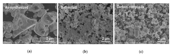 The XRD data for as-synthesized Sn4P3, ball-milled Sn4P3 and Sn4P3/C composite powders are summarized in Figure 1. The pattern for Sn4P3 (JCPDS No. 03-066-0017) is also shown as the reference. It is confirmed that peak patterns for all sample powders agree well with the reference, suggesting that any structural changes did not occur in the ball-milling and carbon-complexing process. No peaks from carbon were detected in the Sn4P3/C powder because complexed carbon with Sn4P3 has amorphous structure. Figure 2 shows scanning electron microscopy (SEM) images for as-synthesized Sn4P3, ball-milled Sn4P3 and Sn4P3/C composite powders. As-synthesized powder consists of agglomerated particles with a size of 1–5 µm (Figure 2a). After ball-milling, the particle size reduces to 0.5–1.5 µm (Figure 2b). On the other hand, after complexing carbon (acetylene black (AB)) with Sn4P3 by ball-milling, the particle size is not changed remarkably (Figure 2c).