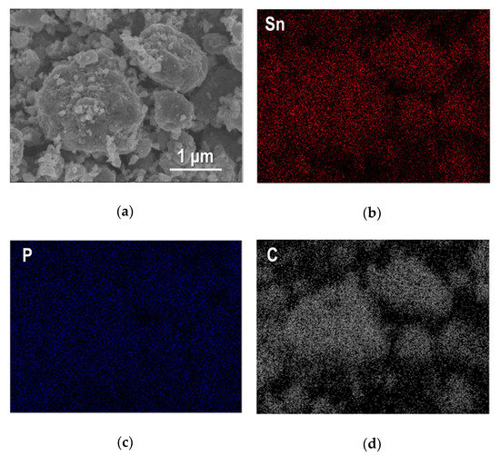 A higher magnified SEM image of Sn4P3/C particles and elementary distributions for Sn, P and C in an observation area are shown in Figure 3. As shown in Figure 3a, the sample powder looks like agglomerated particles with a particle size of about 0.5–2 μm. Sn and P show similar distribution in an observed area and were detected on agglomerated particles, and interestingly, C is also distributed along the particle shape. This suggests that carbon (AB) particles are complexed successfully with Sn4P3 particles by a simple ball-milling process.