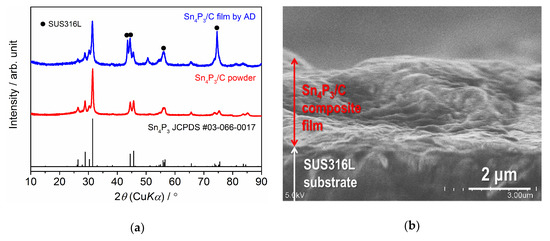 (a) XRD patterns for the Sn4P3/C composite powder and film formed on an SUS316L substrate and (b) cross-sectional SEM image for the Sn4P3/C composite film formed on an SUS316L substrate.