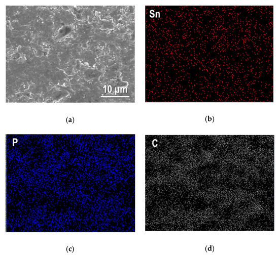 Figure 4 shows the XRD pattern and cross-sectional SEM image of the Sn4P3/C composite film formed on an SUS316L substrate by AD. Note that the peak intensity for the composite film is one order lower than the raw powder. Together with the peaks from the substrate, the peaks from the Sn4P3 phase are clearly confirmed but become broader compared to raw powder. No other secondary phases are formed during film fabrication by AD. The thickness of the composite film is confirmed to be 2.5–3 µm. An SEM image and elementary distributions for Sn, P and C for the broader surface of the Sn4P3/C composite film are shown in Figure 5. It can be seen that the film is composed of deformed or fractured particles. Moreover, Sn, P and C are distributed uniformly in an observed area, suggesting that carbon is included successfully in the film.