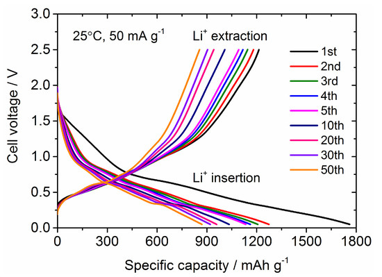 Next, we discuss the electrochemical performance for Sn4P3/C composite film as a LiB anode. Figure 6 shows the galvanostatic charge (Li+ insertion) and discharge (Li+ extraction) curves at different cycle numbers for the Sn4P3/C film electrode in a coin-type cell. The cell voltage window is from 0 to 2.5 V. At the first cycle, charge capacity reaches 1750 mAh g−1, which is much higher than the theoretical capacity (1255 mAh g−1) of Sn4P3, while discharge capacity is confirmed to be 1200 mAh g−1. Coulombic efficiency at the first cycle is 69%, but irreversibility in charge and discharge reaction is greatly reduced after the second cycle and the Coulombic efficiency retains 96–98%. This suggests that the charge capacity in the first cycle includes the contribution of side reactions such as the decomposition of an organic liquid electrolyte at a lower cell voltage to form Li+ conducting solid-electrolyte interphase (SEI) on the electrode surface. The reversible capacity decreases monotonically with cycling but retains a high capacity of 800 mAh g−1 at the 50th cycle. The averaged operation potential is approximately 0.7 V and step-like profiles are confirmed in both charge and discharge processes, which is consistent with the results reported in the literature [8,9,10,11].