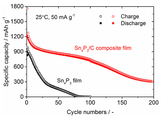 Comparison of cycling stability of charge and discharge capacities for the Sn4P3/C composite film and the Sn4P3 film electrodes. Cell voltage window for galvanostatic cycling is 0–2.5 V.