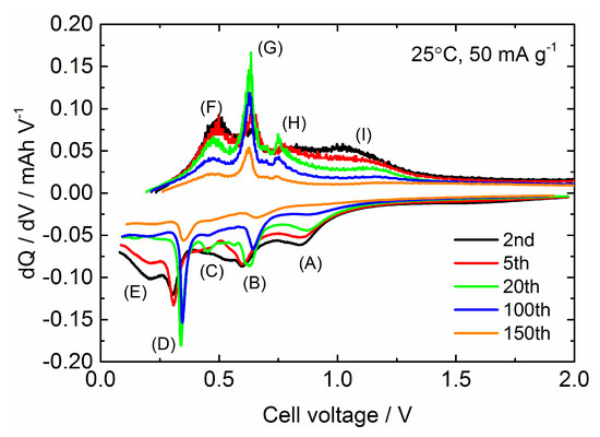 As shown in Figure 7, the degradation mode of the Sn4P3/C composite film in galvanostatic cycling seems to be classified into three processes: (1) Rapid degradation below 15 cycles, (2) gradual degradation from 15 to 100 cycles, (3) accelerated degradation after 100 cycles. In order to further examine the degradation process, differential capacities dQ/dV (Q: capacity (mAh), V: cell voltage (V) are calculated and plotted against a cell voltage in Figure 8. Based on the examination of the electrochemical reaction mechanism for Sn4P3 anode characterized by ex-situ XRD and X-ray absorption spectroscopy (XAS) analysis in the literature [8], the reactions occurring in the charge process are considered as follows: (A) Li+ insertion into the layered structure of Sn4P3 (at ~0.85 V), (B) Formation of LiP and partial transformation from LiP to Li3P (at ~0.65 V), (C) and (D) Alloying of Sn with Li to form LixSn alloy (at ~0.5 V and ~0.3 V) and (E) Formation of Li3P and LixSn (at <0.25 V). On the other hand, reactions in the discharge process are considered as follows: (F) and (G) Dealloying reaction of LixSn (at ~0.45 V and ~0.65 V), (H) Dealloying reaction of LixSn and Li extraction to Li3P to form LiP (at ~0.75 V) and (I) Li extraction from LixP (at >0.8 V). Labels (A)–(H) for these expected reactions are also plotted in a graph.