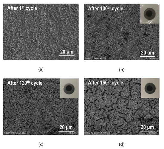 For further examination, we fabricated another Sn4P3/C composite film to observe the change of the microstructure during the galvanostatic cycling. After the galvanostatic testing with different cycles, we took out the film electrodes of the disassembled cells and confirmed that all the films were not delaminated from the SUS316L substrates (see insets in Figure 9). SEM images for Sn4P3/C composite film after the first, 100th, 120th and 160th cycle are summarized in Figure 9. It is worth noting that capacity fading behavior with cycling for all Sn4P3/C films is nearly the same as the data shown in Figure 7. After the first cycle (Figure 9a), it can be seen that the asperities on the surface of the composite film are clearly increased compared to the as-deposited film (Figure 5a). This is caused by the large volume expansion and contraction in the charge and discharge reactions of active material. Such structural change is repeated during cycling and induces the gradual capacity fading with cycling. At the 100th cycle (Figure 9b), generation of many small cracks and agglomeration of the particles are confirmed and become significant with further cycling (Figure 9c,d). The former breaks the electrical conduction path and the latter reduces to electrochemical utilization of active materials in the composite film, resulting in acceleration of the degradation of reversible capacities after 100 cycles as shown in Figure 7.
