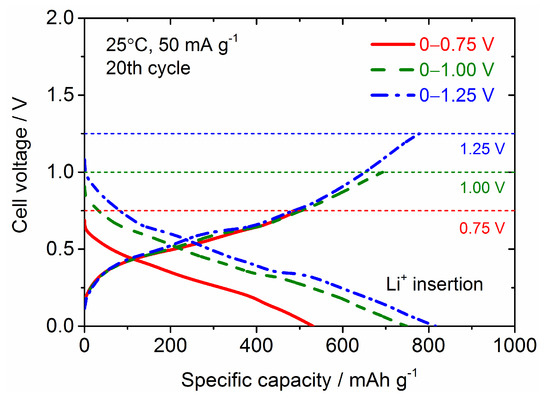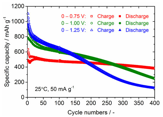 The improvement of the cycling stability of the Sn4P3 anode has been demonstrated by controlling the cell voltage window in the literature but the cycle numbers were limited to only 50 [8,9], so we investigated the long-term cycling stability for Sn4P3/C composite films at different cell potential windows of 0–0.75 V, 0–1 V and 0–1.25 V. The galvanostatic charge and discharge curves at the 20th cycle and cycling performance for Sn4P3/C composite films tested at different cell potential windows are shown in Figure 10 and Figure 11. Although the reversible capacities at the 20th cycle reduce monotonically with decreasing cell voltage for discharge from 1.25 to 0.75 V, the cycling stability is dramatically improved. The film tested at 0–0.75 V shows a reversible capacity of 380 mAh g−1 at the 400th cycle and the capacity retention reaches 80%. The film electrodes tested at 0–1 V and 0–1.25 V also show higher reversible capacities of 400 and 500 mAh g−1 at the 200th cycle than the film tested at 0–2.5 V (300 mAh g−1, see Figure 7), but the capacity fading is accelerated with further cycling. Reversible capacities at the 400th cycle for the films tested at 0–1 V and 0–1.25 V are only 250 and 110 mAh g−1, respectively. By limiting the potential for discharge below 0.75 V, the extraction reaction of Li from LixP with a larger volume change is greatly suppressed, which could contribute to better cycling stability.