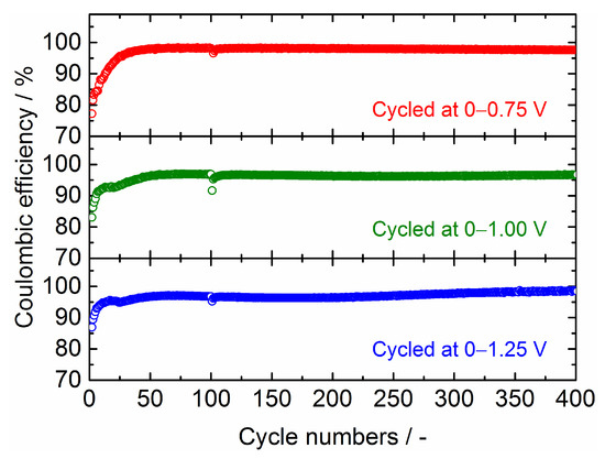 In Figure 12, the Coulombic efficiencies for Sn4P3/C composite films tested at different cell voltage windows are plotted against the cycle numbers. It can be seen that the efficiency for the initial several cycles becomes lower by reducing the cell voltage for discharging (Li extraction) from 1.25 to 0.75 V. This is mainly attributed to the reduction of the Li+ extraction reaction from LixP that occurred at a cell voltage above 0.8 V. After 20 cycles, the efficiencies for all films reached approximately 95%. After 40 cycles, the film tested at 0−0.75 V shows an efficiency as high as 97−98% and maintains it stably in whole measurement range. This is consistent with the good cycling stability of this film (Figure 11). On the other hand, the films tested at 0–1 V and 0–1.25 V show a slightly lower efficiency of 96−97% after 40 cycles.