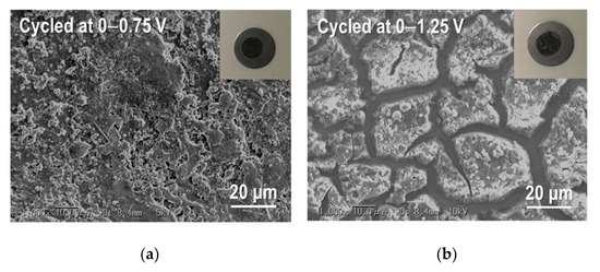 For further examination, we took the Sn4P3/C composite film electrodes out of the disassembled cells after cycling at different cell voltage windows and observed their microstructures by SEM (Figure 13). As shown in Figure 13a, no delamination of the film from the SUS316L substrate was observed after cycling at 0–0.75 V. In addition, the structural change of the film cycled at 0–0.75 V is less than that for the film cycled at 0–1.25 V, which contributes to the better cycling performance. For the film cycled at 0–1.25 V with the lowest capacity retention (Figure 13b), delamination of many parts of the film from the substrate is confirmed and the large transversal cracks were generated at the location without peeling.