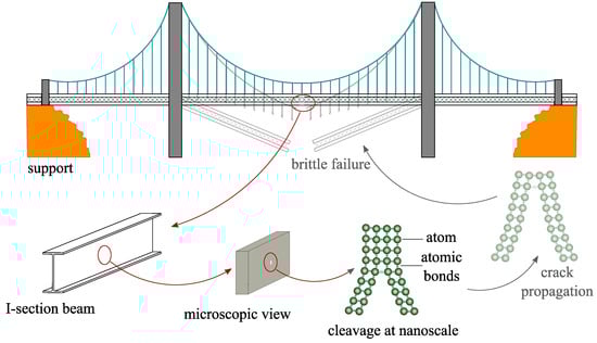 In general, the fracture in materials usually initiates locally from a crack tip, which results in a global failure through crack propagation across the whole structure. In this connection, Figure 1 shows a schematic representation of a bridge, wherein a nano crack (cleavage) is initially presented. Due to the applied loading, high stresses occur at the nano crack tip, which might be followed by macroscopic crack propagation and potential collapse of the bridge. Therefore, understanding the mechanical response of the material under crack initiation and propagation at the atomic level is of great importance in fracture mechanics [5,6]. In this connection, multi-scale nano-macro analyses of brittle fracture that include scaling the atomic bond breaking forces have been introduced in, e.g., [7], where the forces next to the sharp crack tip and the atomic bond breaking process were addressed.
