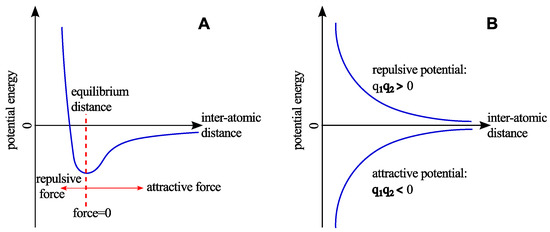 A schematic representation of the non-bonded interactions. (A) The Lennard-Jones potential shows the weak attraction and strong repulsion. (B) The Coulomb potential represents the interaction between two particles of same and opposite charges.