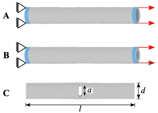 MD simulation setup: Schematic representation of (A) SWCNT and (B) DWCNT pulling. (C) Describes the dimensions of cracked CNT, where l, d and a represent the length, diameter and crack length, respectively. All the models were fixed at one end and pulled at another end.