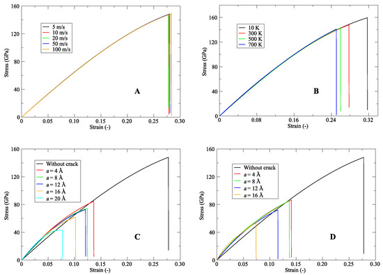 Stress–strain behaviour for (A) a range of pulling speed, and (B) change in temperature of the (20,20) SWCNT. Moreover, stress–strain trajectories for various crack depths of (C) SWCNT and (D) DWCNT.
