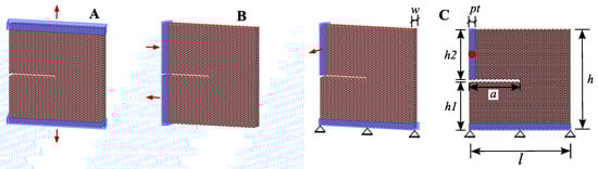 Recently, Patil et al. [17] investigated the impact of crack length on the fracture properties, such as the fracture strength, toughness and strain energy release rate, using an all-atom model of 5.07 million atoms. In contrast to the finite element method (FEM), MD simulation nodes and elements (distance between nodes) are constructed not on an arbitrary basis, but more fundamental theories in chemistry, namely, the atoms as the nodes, the crystal lattice as the FEM mesh, and separated distances are based on the interatomic potentials. In contrast to FEM, atoms (nodes) and distance between atoms (elements) in MD simulations are not randomly defined but are governed by fundamental theories in chemistry. MD simulations provide a higher resolution in space and time of the fracture process compared to a continuum mechanics approach. Thus, nanoscale mechanics can be effectively investigated in detail by MD simulation. On the other hand, the system constitutes an enormous number of atoms, and it is essential to consider the interactions of several hundred to millions of atoms. Therefore, one may encounter situations where time and/or size constraints become indispensable. However, with the advancement of computer science and technology, MD simulations can nowadays be carried out on systems consisting of millions of atoms and simulation times up to one millisecond. Thus, in the recent years, MD simulations have been accentuated to study brittle fracture mechanisms of material at the nanoscale [18,19,20,21,22,23,24,25,26,27,28].