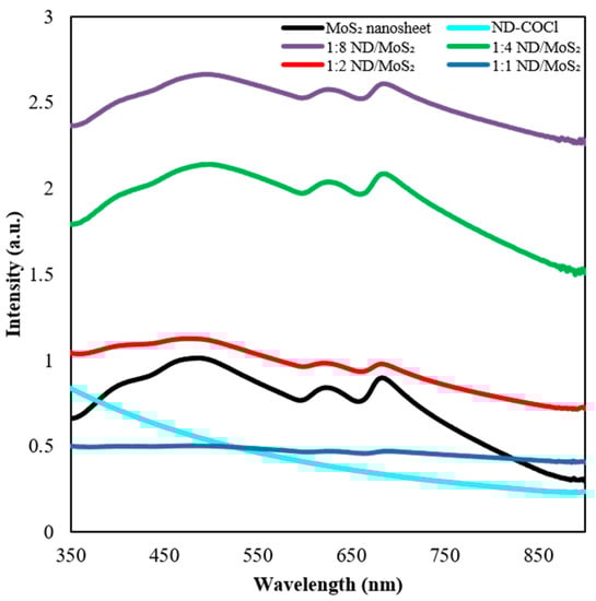 UV–vis absorption spectra were obtained for the MoS2 nanosheets, ND-COCl, and ND/MoS2 nanocomposite with ratios of 1:1, 1:2, 1:4, and 1:8 (Figure 1). Typical MoS2 excitation absorption peaks, which occurred at 630 and 690 nm, were attributed to the direct gap transitions at the K point [30,31,32]. These indicate the lowest optical band gap of the MoS2 nanosheets (i.e., ~1.8 eV) that were changed, owing to the quantum confinement in the sheets. Changes in the UV absorbance were evaluated for the MoS2/ND nanocomposite with ratios of 1:1 to 1:8. The optical absorbance peaks of MoS2/ND nanocomposite appeared in the same region as those of the MoS2 nanosheets. It was indicated that chemically conjugated MoS2/ND nanocomposite maintained the optical characteristics of the nanosheets. The intensity of the bands in the spectra were augmented with the increasing ratio of the nanocomposite, as shown in Figure 1 [33].