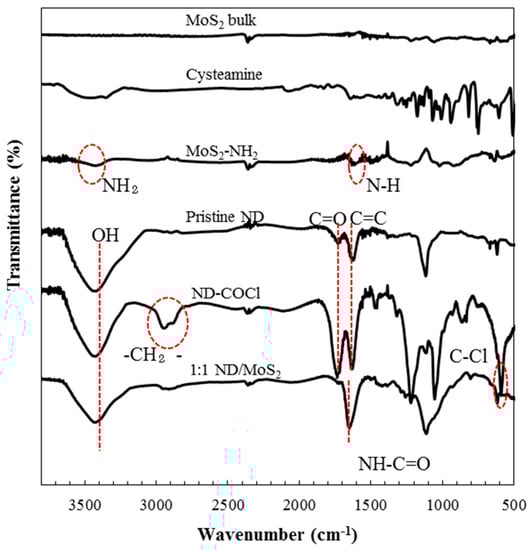 FT-IR spectra of the MoS2 bulk, cysteamine, amine-functionalized MoS2 (MoS2-NH2), carboxylated ND, acyl chloride of ND, and ND/MoS2 nanocomposite with ratio of 1:1.