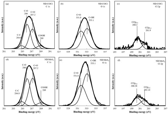 Spectra obtained via X-ray photoelectron spectroscopy. The spectra show the C1s peaks, O1s peaks, and Cl2p peaks, respectively, of the (a)–(c) ND-COCl and (d)–(f) ND/MoS2 nanocomposites.