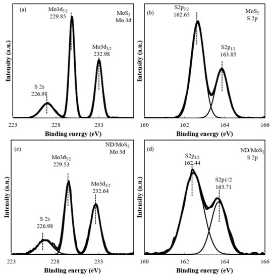 Spectra obtained via X-ray photoelectron spectroscopy. The spectra show Mo 3d peaks and S 2p peaks of the (a)–(b) MoS2 nanosheets and (c)–(d) ND/MoS2 nanocomposites.