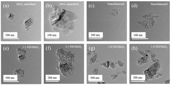 The morphologies of MoS2, ND, and ND/MoS2 nanocomposites (Figure 5) were evaluated with TEM. The MoS2 nanosheets was featured as average size of 300–400 nm along the long axis (Figure 5a,b). The MoS2 nanosheets had a crystalline structure, and several molecular layers were stacked or folded in a planar form [44]. Furthermore, the NDs were well-dispersed with small agglutinins ranging from 80 to 200 nm (Figure 5c,d). The ND/MoS2 nanocomposite with chemical conjugation showed morphological features that several molecular layers of thin MoS2 nanosheet enveloped ND agglutinins (Figure 5e–h). Amine-functionalized MoS2 nanosheets and NDCOCls were chemically reacted through surface contact, suggesting that the ND/MoS2 nanocomposite was successfully synthesized (Figure 5e–h).