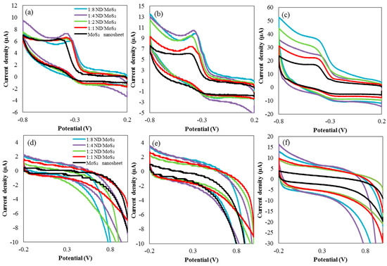 On the same material set, scan rates of 0.05, 0.1, and 0.5 V/s, respectively, and range of potential voltage was differently applied to −0.8 to −0.2 V and −0.2 to 1.0 V. The shape and magnitude of the voltamogram was transitioned from a peak-like shape (Figure 6a–c) to quasi-rectangular shape (Figure 6d–f) depending on the scan rate and potential voltage. The quasi-rectangular shape typically indicates constant and time dependent concentration gradient of an electroactive surface where the electrode radius was typically smaller than diffusion layer [47]. Each CV graph is characterized by a quasi-rectangular shape, consistent with dual behavior, such as the electrical double layer capacitance [48]. MoS2 nanosheets constitute the minimum area of the CV plot, whereas 1:8 and 1:6 ND/MoS2 constitutes the maximum area, which corresponds to the enhanced capacitance. The CV curve of the ND/MoS2 nanocomposites reveals the higher current response and large working area of these composites, compared with those of the MoS2 nanosheet only (Figure 6). The results suggest that the addition of nanodiamonds enhances the electrochemical activity and increases the specific capacitance of MoS2 electrode alone [29,35].