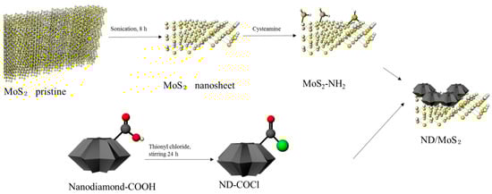 Therefore, in this study a ND/MoS2 nanocomposite by subsequent functionalization was synthesized and characterized. An ND with a graphitic shell around its surface provides stable sites for chemical modification. Immediate chemical reaction between the acyl chloride of NDs and amine-functionalized MoS2 was intended to form aggregation-free MoS2 nanosheet dispersion on the ND support (Scheme 1). This nanophase dispersion of MoS2 in several interlayers on the ND platform was examined from the viewpoint of physical characteristics and potential electrofunctionality.