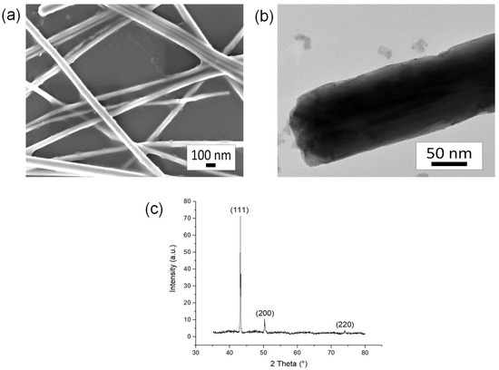 (a) FESEM image, (b) TEM image, and (c) XRD diffractogram of copper nanowires (CuNWs).