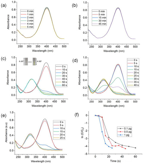 As can be seen from Figure 2b, the adsorption peak at 400 nm stayed almost unchanged in intensity for a long time which shows that the reduction of 4-nitrophenolate with only NaBH4 occurred very slowly. Amazingly, just by adding a minuscule amount of CuNWs (0.1 pg), the reduction process occurred instantaneously. As the peak of 4-nitrophenolate at 400 nm decreased, a new absorbance peak of 4-AP at 315 nm [20] emerged and increased with time. At the same time, the yellow color of 4-nitrophenolate changed to colorless, which also indicated the formation of 4-AP [42]. Figure 2c–e shows that by increasing the amount of CuNWs, the rate of catalytic reaction increases as well. Conversion of 4-NP to 4-AP up to 99% occurred in just 60, 40, and 25 s by using CuNWs loading of 0.1, 0.5, and 1 pg, respectively.