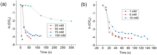 Figure 3a shows the plot of ln (C/C0) against time for every concentration of NaBH4 tested. As the concentration of NaBH4 increases, the time taken for completion of reduction increases as well. The percentage of conversion also decreases with increase of NaBH4 used. For 25 and 50 mM of NaBH4, the time taken for 99% reduction is 10 and 60 s, respectively. Next, it takes 120 s for 75 mM of NaBH4 used to reach reduction percentage of 98%. Lastly, reduction percentage of 87% was reached in 300 s by using 100 mM NaBH4. The kapp also decreases with increasing concentrations of NaBH4 tested. The kapp for 25, 50, 75, and 100 mM are 0.433, 0.076, 0.027, and 0.0019 s−1, respectively. This is due to the inability of CuNWs to relay excess electrons [55,56].