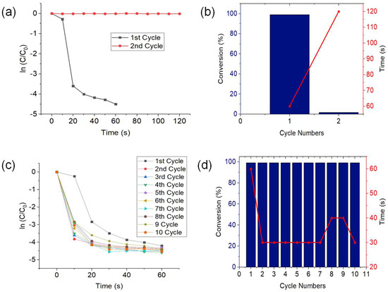 (a) Plot of ln(C/C0) against the time for the reduction (b) conversion percentage of 4-NP and reaction time without retreatment of GAA, and (c) plot of ln(C/C0) against the time for 10 cycles, and (d) conversion percentage of 4-NP and reaction time with retreatment of GAA.