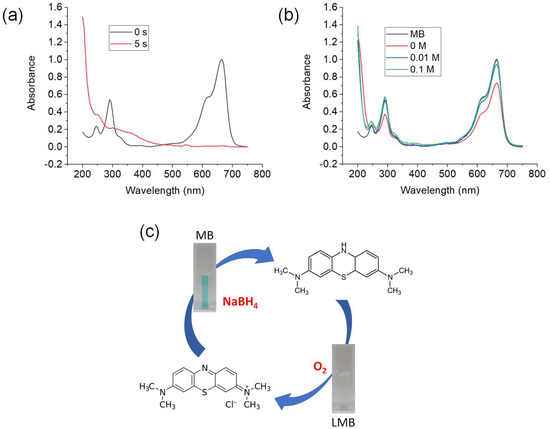 It can be seen from Figure 5b that when NaOH is added into the solution, the maximum absorbance value at λ665 significantly increased. This shows that NaOH could help in the oxidation of LMB to MB. The absorbance value at λ665 rose to 0.948 and 0.9967 when 0.01 and 0.1 M of NaOH was added, respectively. Both are of higher absorbance value compared to the absence of NaOH. This also shows that higher concentration of NaOH could effectively oxidize more LMB to MB. This is probably due to the hydroxyl ions from NaOH. The hydroxyl ions would create an oxygen rich environment for LMB to convert back to MB. When higher concentration of NaOH is added, the amount of hydroxyl ions increased [66] which affects the oxidation of LMB. Furthermore, the recolorization rate increased when NaOH is added. In absence of NaOH, it takes around 10 min for maximum conversion of LMB to MB in ambient condition. Just by adding 0.01 M NaOH, the highest absorbance can be obtained in 30 s and this is similar when 0.1 M NaOH is added. This shows that NaOH also helps in speeding up the recolorization process of MB. Figure 5c shows the schematic diagram of color switching between MB (blue) and LMB (colorless).