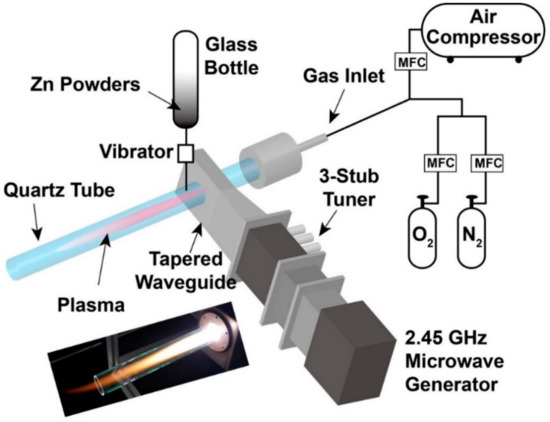 The microwave plasma apparatus for ZnO synthesis consisted of a 2.45 GHz microwave generator (LG, 2M246, Busan, Korea), a tapered waveguide, and quartz tube with an inner diameter of 28 mm as shown in Figure 1. There is a 3-stub tuner between the microwave generator and the waveguide, which protects the generator by preventing reflection. As shown in Figure 1, the quartz tube is installed through the tapered waveguide and the atmospheric plasma is ignited in the quartz tube with high density and temperature. For a typical air plasma, the plasma density is about to 1013 cm−3 and the maximum plasma temperature is 6500 ± 350 K [24]. Thus, microwave plasma at atmospheric pressure provides a highly reactive chemical environment in which various reactions can take place.