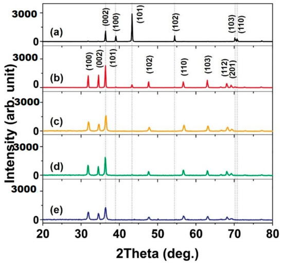 XRD spectra of (a) Zn powder and synthesized ZnO nanomaterials using (b) compressed air, (c) high-purity air, (d) O2, and (e) O2/N2 mixed gas.