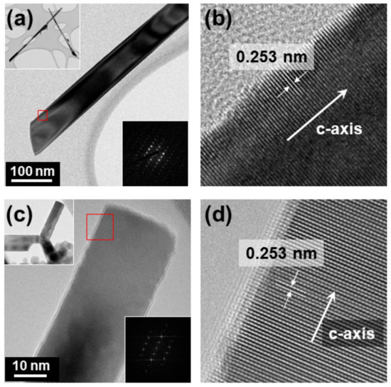 In addition to the morphology analysis using SEM, TEM was employed to confirm the detailed crystal structure of synthesized ZnO. The representative TEM results of the ZnO nanowires and tetrapods synthesized using compressed air are shown in Figure 4. The analyzed nanowires had a diameter of 71.5 nm and a length of 2.5 μm. The selected area electron diffraction (SAED) pattern analysis confirmed that single crystal ZnO nanowires of a hexagonal crystal structure and space group of P63mc were synthesized (Figure 4a). The interlayer distance was found to be 0.253 nm which is approximately half of the 0.518 nm lattice constant of ZnO [JCPDS file No. 79-0205] in Figure 4b, and it was confirmed that the axial direction of the wire was the C-axis direction of the crystal structure (Figure 4b). In the case of tetrapod-type ZnO, the diameter was measured to be 25.8 nm and the length ranged from 106–140 nm. Fast Fourier transform pattern (FFT) analysis confirmed that the tetrapod-type ZnO was also monocrystalline (Figure 4c). The interlayer distance was also measured to be 0.253 nm, and it was confirmed that the axial direction of each pod was the C-axis direction of the crystal structure (Figure 4d).