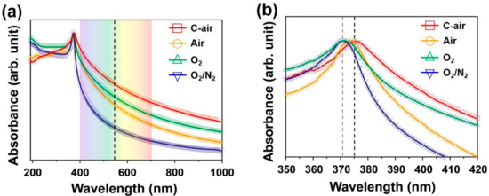 (a) Wide-range and (b) narrow-range UV-visible absorption spectra of ZnO nanomaterials synthesized using different gases.