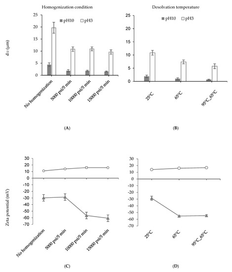The surface charge of all particles at pH 3 showed positive charge as the amino groups were protonated, while the ones prepared at pH 10 possessed negative charge resulting from the deprotonation of –COOH groups (Figure 1C). The charge on the particles decreased with the increase of desolvation ratio up to 3×, and thereafter no change was observed. Similar behavior of decrease in zeta potential of soy protein nanoparticles with increase in alcohol concentration was also reported by Teng, et al. [22]. Presence of ethanol decreased the dielectric constant of the solution, which hindered the ionization of charge groups on the protein leading to a lowering of zeta potential. No significant effect of homogenization on surface charge of the particles was observed except at 1× desolvation. Absolute charge of the particles fabricated at pH 10 was higher than those at pH 3 which could be responsible for higher repulsion and lower particle size at pH 10 compared to the lower pH. At an alkaline pH, the hexameric structures of pea globulins were loose, their chains unfolded, and the charges became more accessible [23]. At an acidic pH, below the isoelectric point (pI), the COO− groups of proteins were protonated, making them uncharged (COOH), and their zeta potential decreased [24].