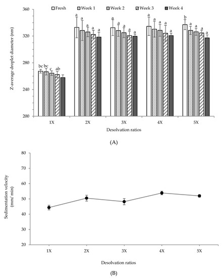 From the above discussion, it is apparent that the most stable re-dispersion of PPN were obtained at pH 7. Therefore, long-term stability for all PPN re-dispersions (prepared with different desolvation ratios) was recorded at pH 7 during 4-week storage at 25 °C (Figure 6A). The particle size of the re-dispersed PPN was too small to analyze using a static laser diffraction analyzer. Hence a dynamic light scattering device was used. The decrease in particle size after re-dispersion could be attributed to the change in the solvent from ethanol-rich to a simple aqueous phase which could solubilize a part of the nanoparticles. Also, re-dispersion in aqueous phase led to loss of aggregated particle structure and it was possible to measure the actual nanoparticle size. There was no significant difference in the Z-average particle size between the freshly re-dispersed 2×, 3×, 4×, and 5× PPN, which were between 333–337 nm, higher than the size of re-dispersed 1× PPN (267 nm) (Figure 6A). Probably the 1× desolvated particles were more soluble leading to a significant loss of particle morphology. After 4-week storage at 25 °C, there was a reduction on the average particle sizes, which might also be due to the dissolution of larger PPN. However, this decline was not statistically significant (p > 0.05) except for 1× and 5× PPN. Quantitative estimation of stability of all the PPN re-dispersions at pH 7.0 was obtained by measuring the rate of sedimentation under accelerated gravitation (1000 rpm, ~130 g) (Figure 6B). As expected, lowest sedimentation rate was obtained for 1× desolvated PPN re-dispersion as their particle size was lowest, and the rate increased with an increase in desolvation ratio. Microstructure of the re-dispersed PPN at pH 7 also displayed the appearance of aggregated nanoparticle structure (Figure S4, supplementary data), which confirms that at pH 7 the PPN structure remained stable and they were not completely soluble.