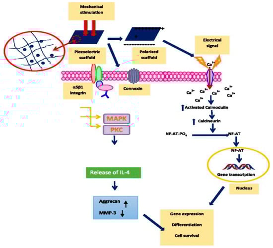 Human bones have the ability of self-remodeling through an electromechanical mechanism due to the piezoelectric effect [163]. Thus, mechanical stimulation of bones induces their growth and regeneration as a result of the generation of electrical potential [3,23]. The application of electrical stimulation has been found to be effective in enhancing rat bone marrow mesenchymal stem cells (rBMSCs) and rat adipose-derived mesenchymal stem cells (AT-MSCs) migration, proliferation, differentiation, and stimulates high levels of osteogenic expressions. Electrically stimulated rBMSCs and AT-MSCs exhibit an increased osteogenic differentiation, as indicated by high expression levels of osteogenic markers, including collagen 1, osteopontin, Runx 2 and calmodulin [164,165]. Furthermore, electrical stimulation of AT-MSCs also promotes bone repair and bone regeneration in vivo as manifested by implanted scaffolds with AT-MSCs in the rat femur defects [166]. Thus, human MSCs capable of differentiating into osteoblasts show great potential for healing of bone defects [167].