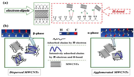 Schematic showing the effect of MWCNTs on the β-phase formation in PVDF: (a) Hydrogen bonding between functionalized MWCNTs and PVDF chains; (b) the adsorbed chains of PVDF on the surface of MWCNTs influenced by the dispersion of MWCNTs. Reproduced with permission from [96], published by Elsevier, 2014.