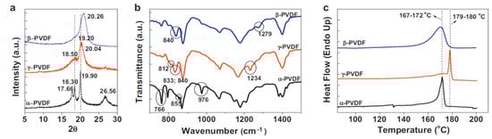 (a) XRD patterns, (b) FTIR spectra, and (c) DSC curves of the polymorphs of PVDF. Reproduced with permission from [2], published by Elsevier, 2014.