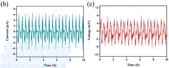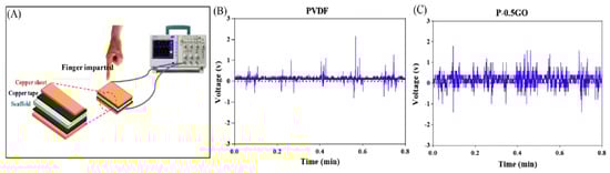 (A) Schematic of piezoelectricity measurement. Output voltage generation from representative (B) PVDF and (C) PVDF/0.5 wt% GO scaffolds. Reproduced with permission from [81], published by Elsevier, 2019.
