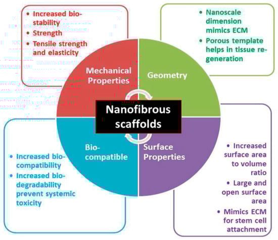 Schematic representation of the required properties of nanofibrous scaffolds including geometry, mechanical competence, biocompatibility and surface behavior.