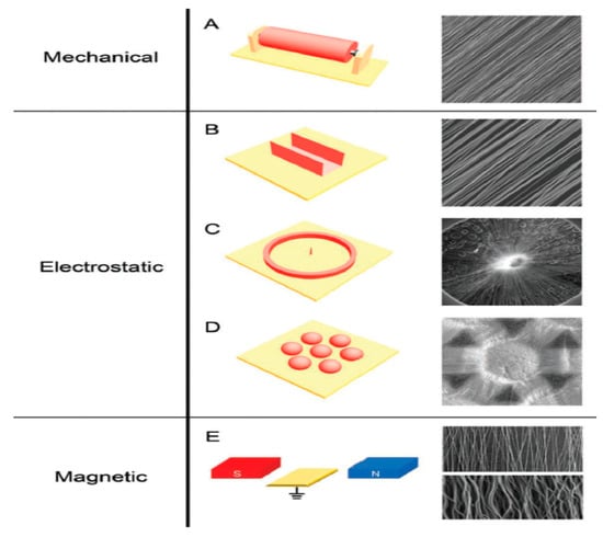 Schematics of electrospinning methods to direct fiber orientation by means of mechanical rotation of mandrel (A), electrostatic forces through the use of a metallic staple (B), a metallic ring (C), and an array of metallic beads (D), as well as magnetic forces through the use of a pair of permanent magnets (E). The yellow plates are grounded conductive electrodes. Scanning electron micrographs in the right panel show the morphologies of aligned nanofibers depositing at the target via different methods. Reproduced with permission from [120], published by Wiley-VCH, 2012. Reproduced with permission from [121], published by American Chemical Society, 2010.