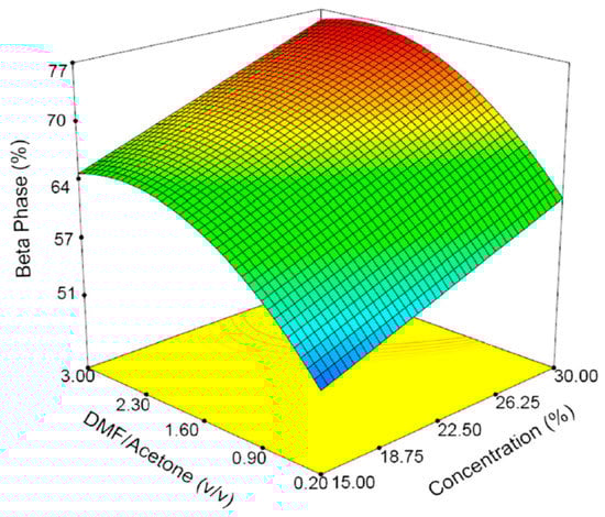Three-dimensional plots of beta phase content vs. PVDF concentration and DMF/acetone ratio. Reproduced with permission from [124], published by Springer, 2018.