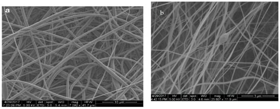 Scanning electron micrographs of electrospun nanofibers with a PVDF concentration of 25% and (a) DMF/acetone ratio of 1, and (b) DMF/acetone ratio of 3. Reproduced with permission from [124], published by Springer, 2018.