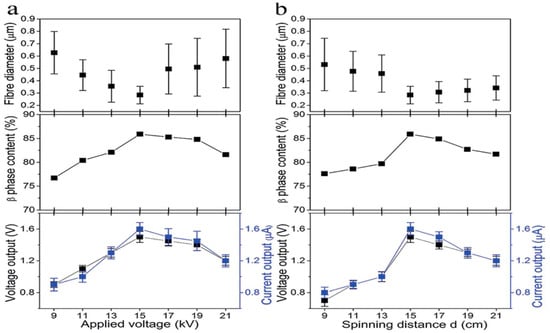 Effects of (a) applied voltage and (b) spinning distance on the fiber diameters, β-phase contents and electrical outputs of PVDF nanofiber mats (PVDF concentration 20%; nanofiber mat thickness 100 µm). Reproduced with permission from [129], published by Royal Society of Chemistry, 2015.