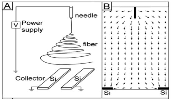 Schematic diagram showing electrospinning setup for forming uniaxially aligned nanofibers. (A) A collector with two pieces of conductive silicon stripes separated by a gap. (B) Electric field strength around the needle and the collector. The arrows denote the direction of the electrostatic field lines. Reproduced with permission from [135], published by American Chemical Society, 2003.